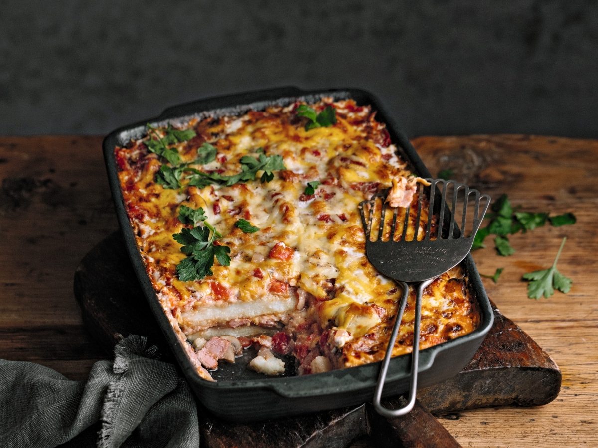 “This is everything you know and love in a good ol’ potato bake, but stacked instead of layered. Not only does stacking look fancy, but it gives all the exposed edges a chance to get crispy and lekker.”